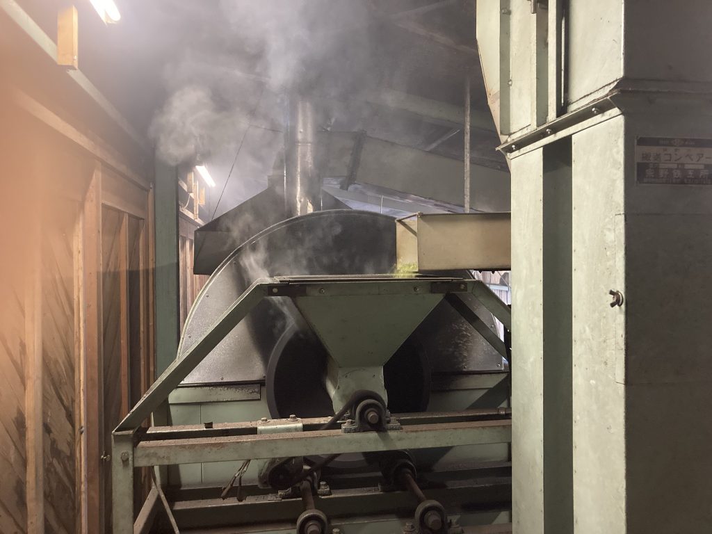 これぞ幻の『砂炒り焙じ機』!! ずいぶん年季の入った機械。 まるで火事のように煙が立ち昇り近寄るのが怖いほど。 動画は茶葉を一回通したところまでですが、もう一回この機械を通します。